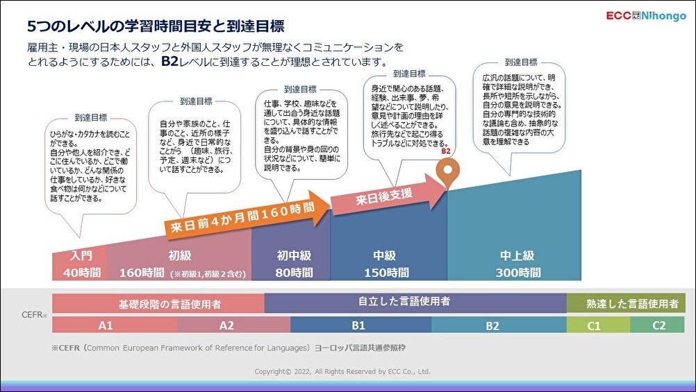 入国前4~6カ月間(在留資格取得期間にあたる)で新たに日本語教育を、「ECCにほんご」にてオンラインで実施。来日までの期間も日本語にふれ続けること、またCEFR(※1)基準のA1からB1レベルへの日本語力アップ(※)を目標にした取り組みです。 ※詳細は次項参照