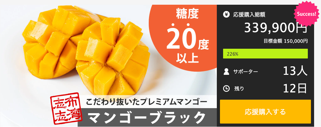 志布志湾マンゴーブラックはMakuakeにて先行販売中。先着数量限定でお得な割引価格が設定されています。