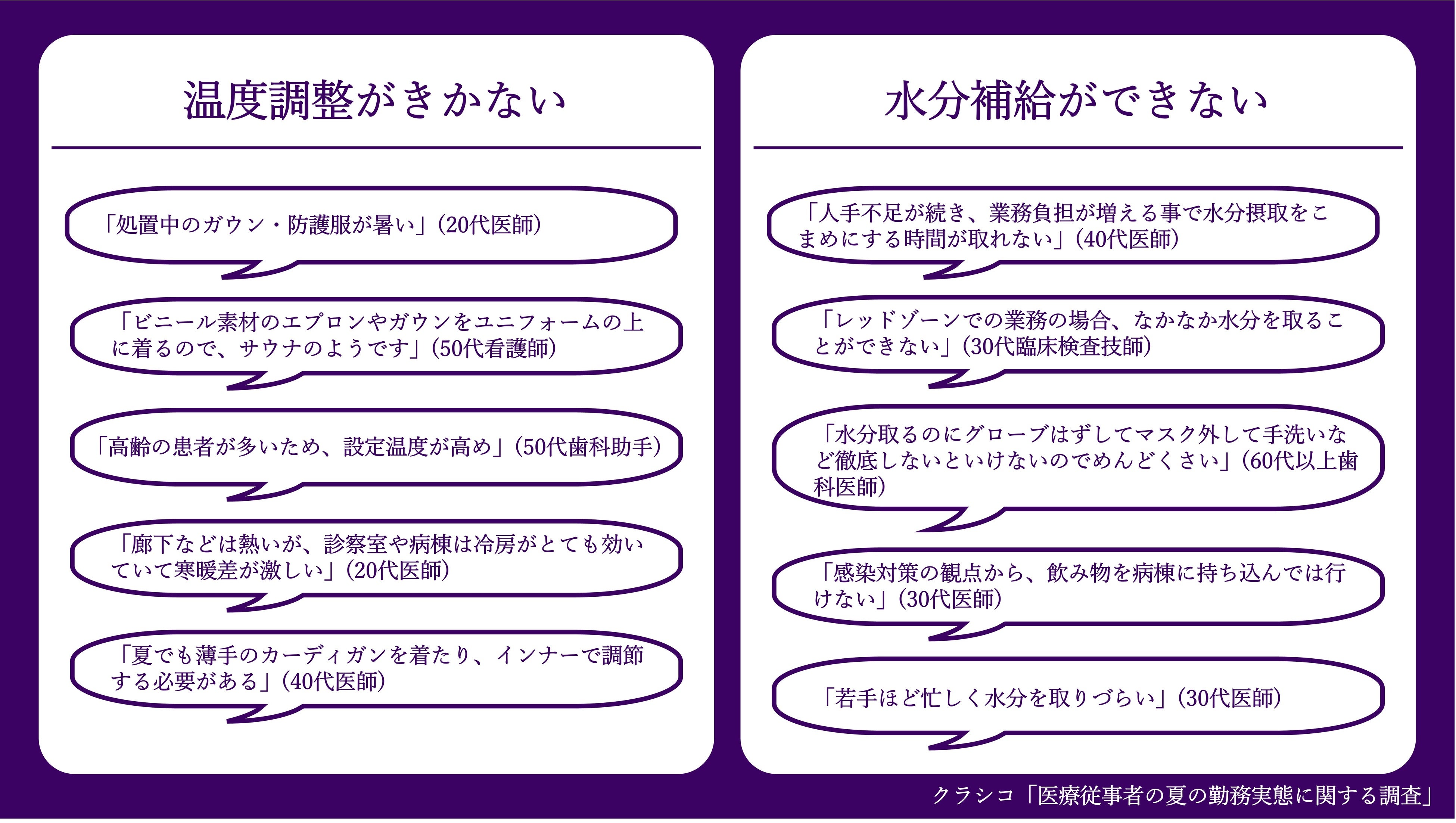 ■「防護服がサウナのようだ」「飲み物を持ち込めない」など、医療現場だからこその悩みの声