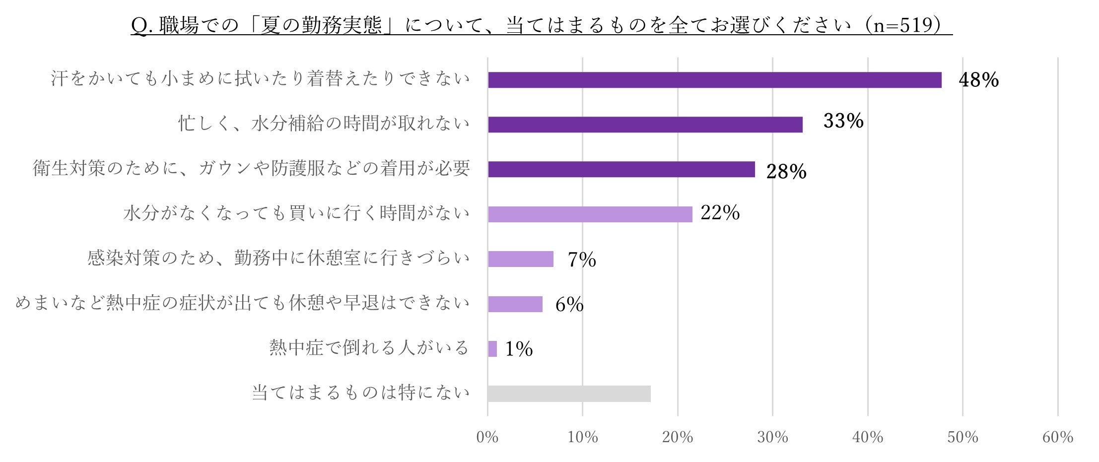 夏の勤務実態について聞いたところ、約2人に1人が「汗をかいても小まめに拭いたり着替えたりできない」と回答。次いで「忙しく、水分補給の時間が取れない」「衛生対策のために、ガウンや防護服などの着用が必要」との回答が全体の3割にのぼりました。多くの医療従事者が、自分で汗や水分補給を調整しにくい環境に置かれていることが明らかになりました。