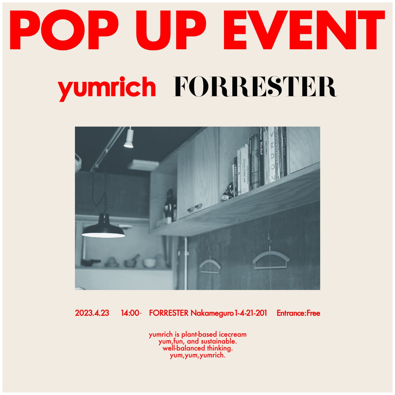 株式会社YUMRICH(本社:東京都渋谷区、代表取締役社長 柳父豊)が手がける国産の植物性ミルクから作るプラントベースアイス『yumrich(ヤムリッチ)』は、2023年4月23日(日)に、中目黒の人気カレーショップ『FORRESTER』にてPOPUPイベントを開催します。イベントでは、FORRESTERのカレーを楽しめる他、特製チャイ、ジン・ライムのイベント限定のコラボレーションフレーバーのyumrichをお楽しみいただけます。