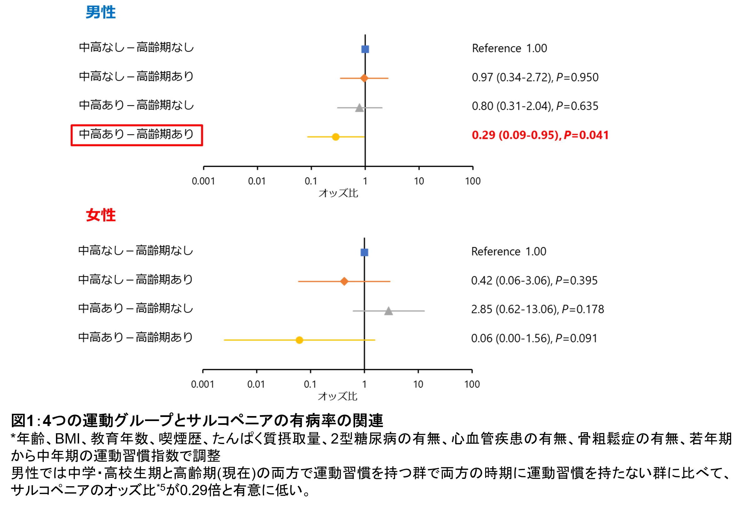 - 中学・高校生期と高齢期の両方の時期で運動習慣がある高齢者では骨格筋機能が高く、サルコペニアのリスクが低いことが明らかとなった。