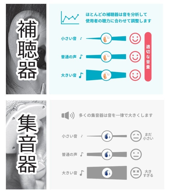 補聴器は使用される方のきこえに合わせて、必要な周波数ごとに音量を上げ下げできることが『集音器』と根本的に違うところです。