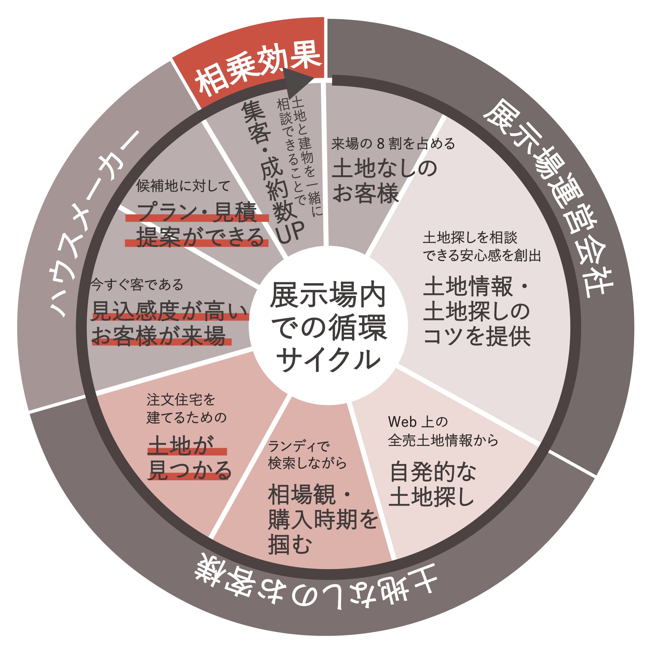 住宅展示場に介在する3者の「土地探しをハウスメーカーに依頼したいお客様」、「他会場と差別化をして、集客、成約率を上げたい住宅展示場運営会社」、「見込感度の高い顧客を集客して欲しい出展ハウスメーカー」といったニーズを満たす上で、各人が主体的に担えるフェーズを明確化し、3者の目的を達成できる循環サイクルを回すことでシナジー効果を高めることができています。