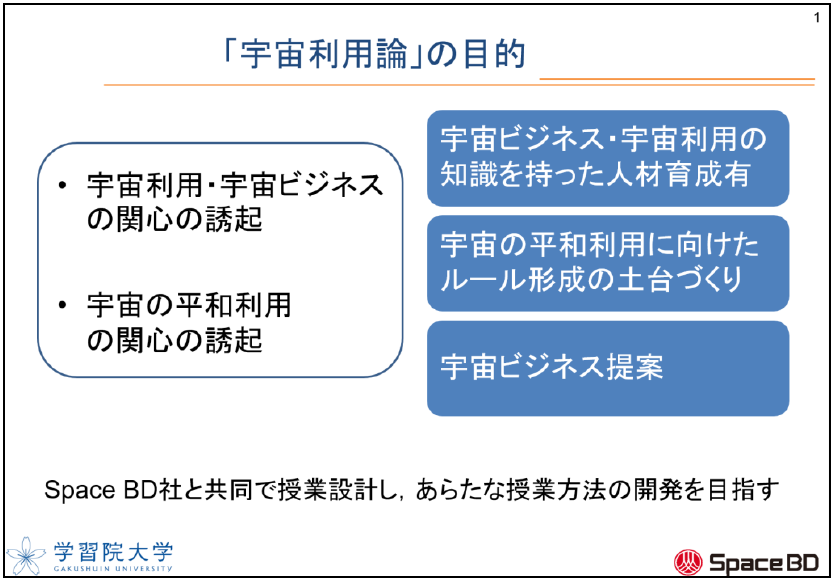 地球を含むすべての天体・宇宙空間を、平和的にかつ持続的に利用していくためSDGsとその先を目指した文理融合の新たな体系構築を目指すものです。学習院大学は、民間事業による宇宙利用が活発化している現代において、宇宙利用を科学・技術のみの視点から学ぶだけではなく、あらゆる視点からとらえる必要があると考え、全学共通科目としての宇宙利用論開講に至りました。
