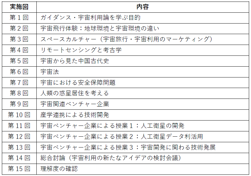 全15回の授業は、宇宙利用に関連した様々なテーマを選出しています。教員の講義に加え、その分野の第一線で活躍するゲストを招き、学術研究のみに留まらない学びの場を提供します。