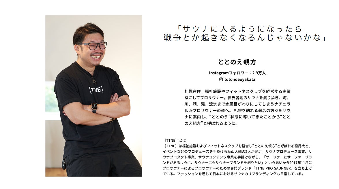 プロジェクトの初回は、「水風呂がないサウナなんて。」をキーワードに、サウナの素晴らしさを、サウナの賢人たちに語ってもらいました。登場するのは、昨今のサウナブームを牽引しているサウナ界から、ととのえ親方とサウナ師匠、そしてサウナ好きタレントとして幅広く活躍中の花山瑞希さん。3名の語るサウナ愛、世界のサウナ最新情報は必見です。