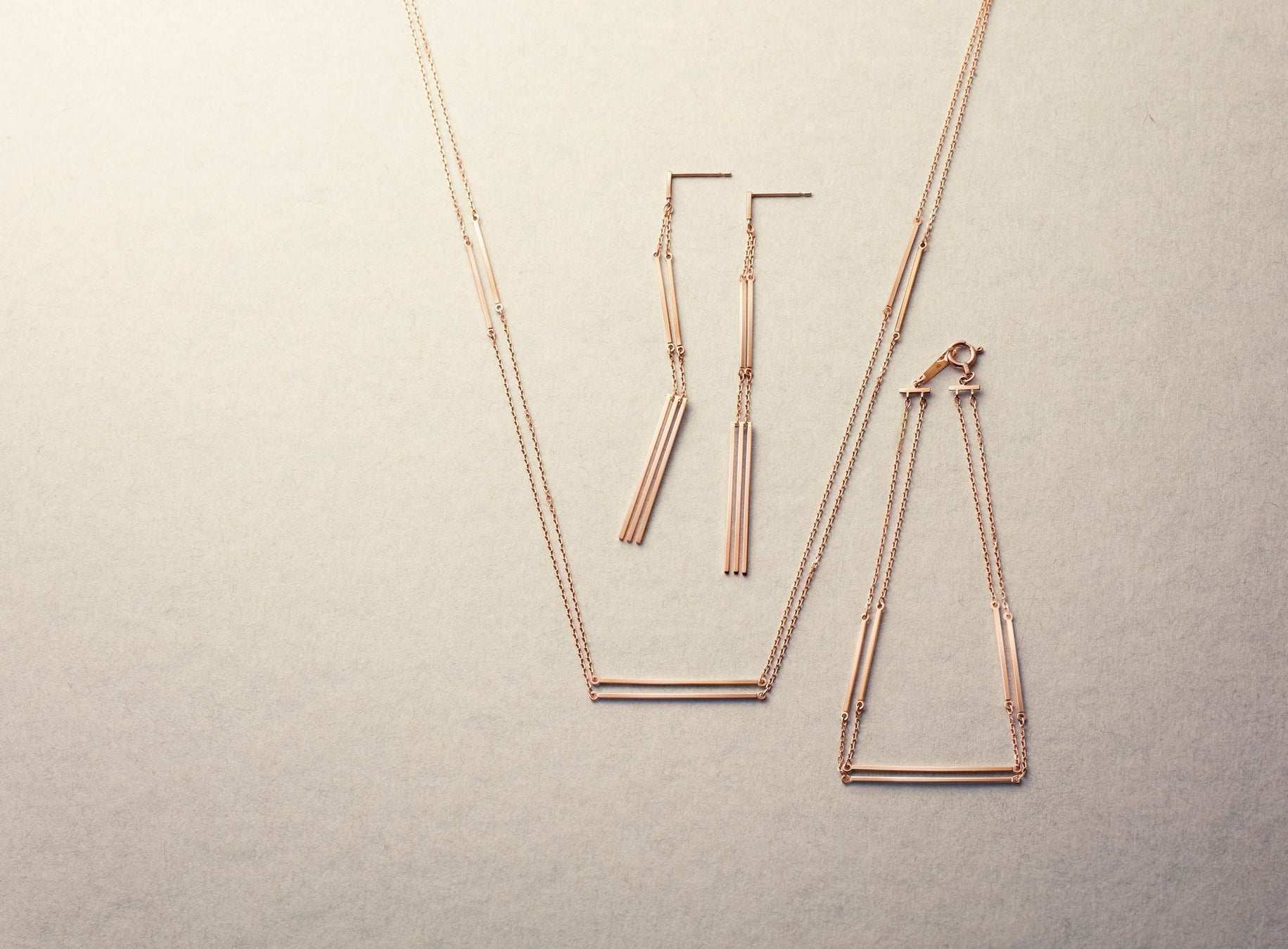 ルーバーを象徴する直線を繊細なチェーンで繋いだジュエリーは、大人ならではの洗練された遊び心が満載! グラフィカルなスリットが生まれるようにデザインされたネックレスとブレスレットは、動くたびに肌の上で表情を変えながら煌めき、ユニークな芸術性の高さを発揮。また顔周りを明るく仕上げるピアスは、間に挟んだチェーンで個性的なエレガンスを演出してくれる。華やかさと知的さのバランスを堪能しよう。