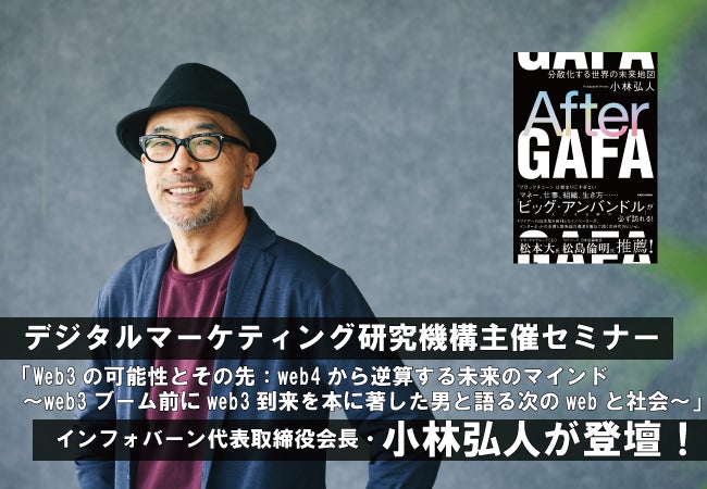 そのデジタルマーケティング研究機構が主催する4月25日(火)のセミナーに、インフォバーン代表取締役会長の小林弘人が登壇いたします。 「Web3の可能性とその先:web4から逆算する未来のマインド〜web3ブーム前にweb3到来を本に著した男と語る次のwebと社会〜」と題し、かねて話題となってきた「web3」を解説するとともに、30年にわたってwebとそれがもたらす社会のあり方を見つめ続けてきた小林が、web3以後のビジネスについて語ります。