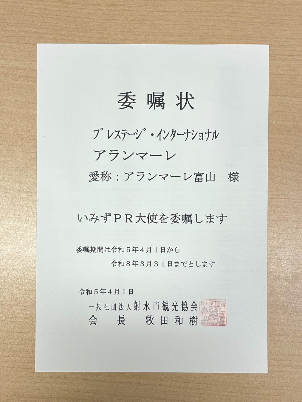 プレステージ・インターナショナル アランマーレ 女子ハンドボールチーム(所在地:富山県射水市、以下「アランマーレ富山」)は、「いみずPR大使」に就任し、4月16日(日)に射水市スポーツフェスタ総合開会式において、委嘱状が交付されたことをお知らせいたします。
