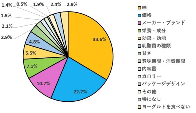 ヨーグルト購入の基準では「味」が一番で33.6%の人が支持しています。物を購入する際の基準では価格がトップに入ることが多いのですが、ヨーグルトでは「価格」は2番手で22.7%となっています。続いて「メーカー・ブランド」が10.7%、「栄養・成分」が7.1%となっています。ヨーグルトには価格以外の物を求めていることが多いのがわかります。