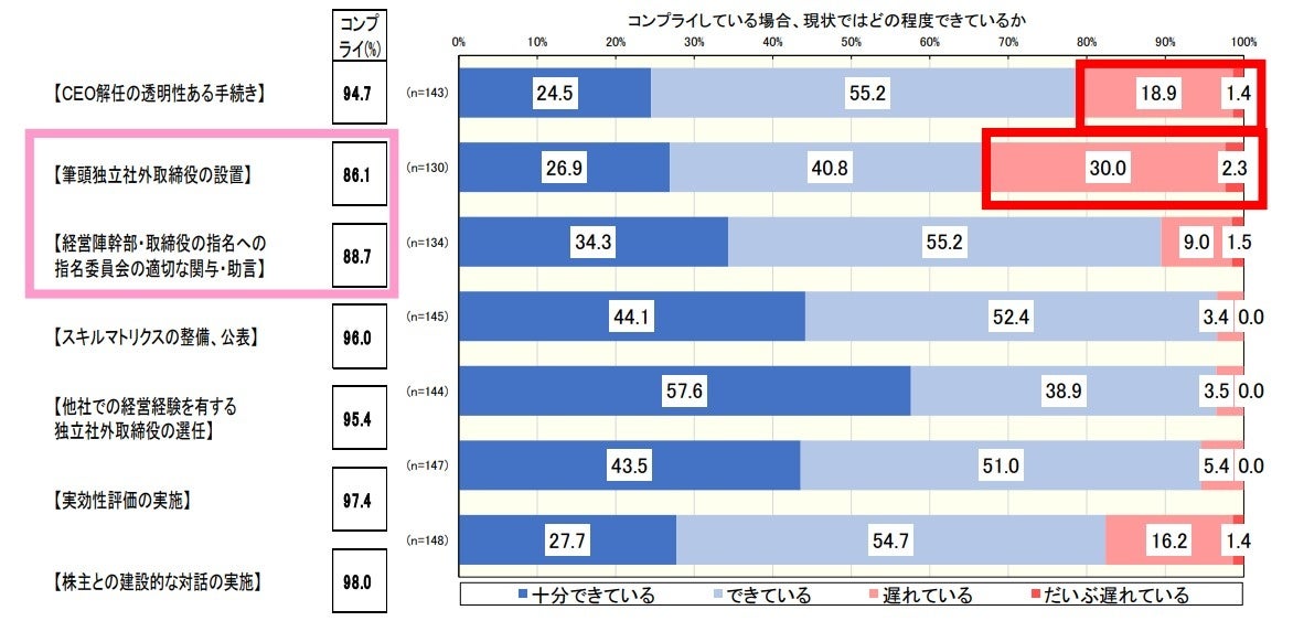 対応では、「サステナビリティ」や「多様性確保」などの項目において、その対応は道半ばの状態にある
