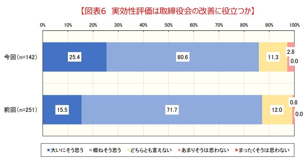 (1) 「実効性評価は取締役会の改善に役立つ」とする企業が前回に引き続き8割を超え、特に「大いにそう