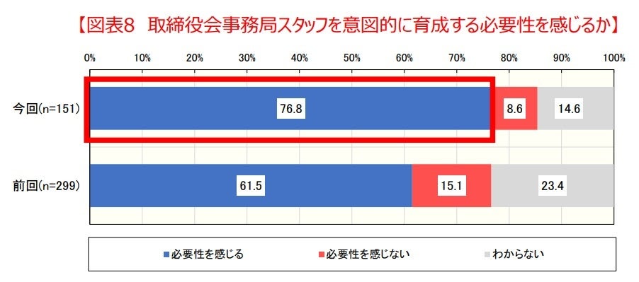 (1) 取締役会事務局スタッフ育成の必要性を感じている企業は7割を超えており、増加傾向にある。