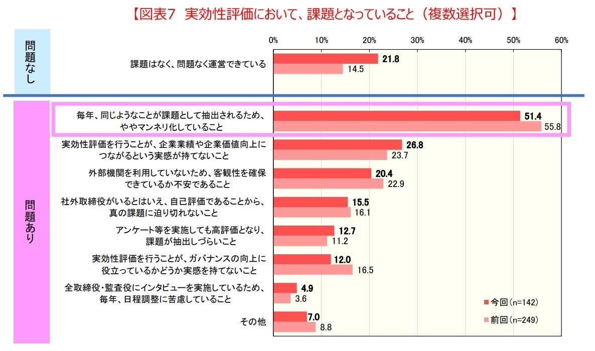 実効性評価は取締役会の改善に役立つと認識する一方で、マンネリ化も感じている。