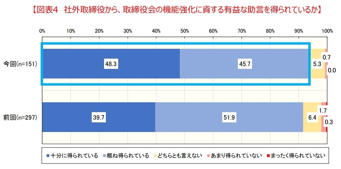 前回に引き続き9割を超え、社外取締役の存在は圧倒的に支持されている。【図表4】