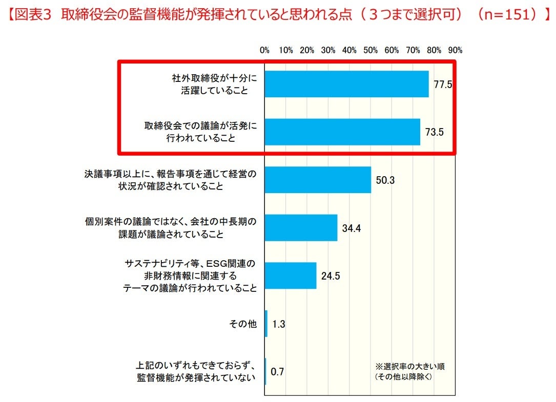 及び「取締役会での議論が活発に行われていること」が上位2項目で、いずれも7割を超えており、