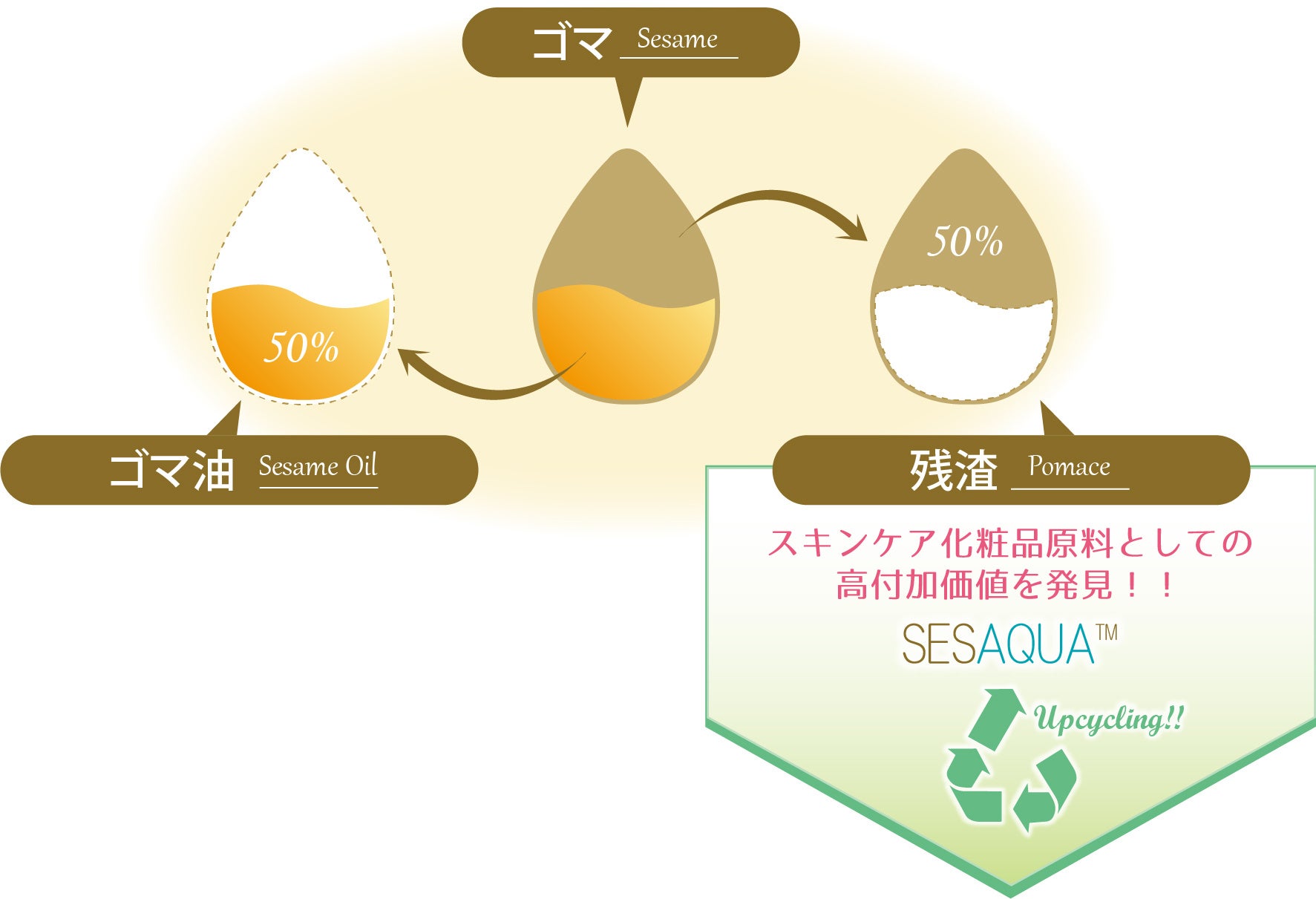 SESAQUA™(セサキュア®)は、「SESAME(ゴマ)×AQUA(アクア、水)」から名付けられた、ゴマ由来のスキンケア成分です。SESAQUA™(セサキュア®)は、ゴマ油の製造工程で出る未利用資源を活用したアップサイクル原料です。ゴマを圧搾すると、50%がゴマ油として抽出され、残りの50%は残渣となります。ゴマ油の製造工程から出る残渣の多くが食品廃棄物として廃棄されますが、当社ではその中に豊富に含まれるタンパク質に着目し、美容成分としてアップサイクルしました。数あるゴマ由来の化粧品成分のほとんどが油溶性であるなか、ゴマタンパク質からなるSESAQUA™(セサキュア®)は、水溶性成分なので、さまざまな剤形の化粧品への配合が可能です。