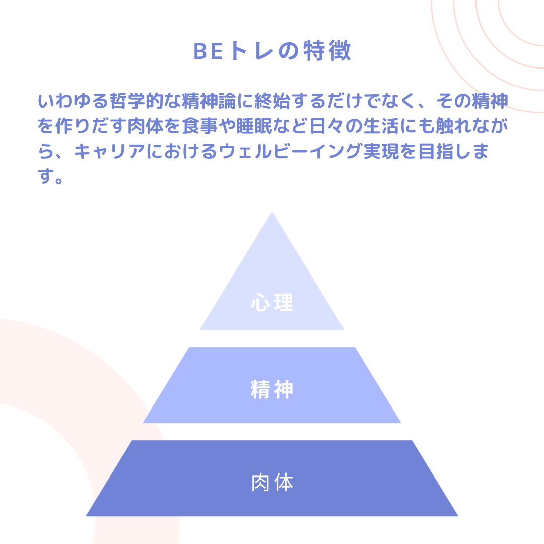Beトレはキャリアを自分らしく、そして気分よく生きたいあたなのためのオンラインサロンです。多くの人が意識しなくてよいところを意識し、逆にしなくてはいけないところを意識していません。Beトレはキャリアをwell-beingするためのまさに意識のトレーニングであり、まずは意識することを意識しながら無意識に向かうワークをしていきます。当サロンではまずは気分よく働いていく為に必要な人に備わる体内リズムを中心に肉体面を、そしてブレインヘルスにて健全脳に、更には俯瞰力を身に付け意識の向かう先をコントロールできるようにし心理面を整え、実際に社会で気分よく自律して働いていくために必要な見方・考え方・捉え方をワークショップなどを通じて学んでいきます。