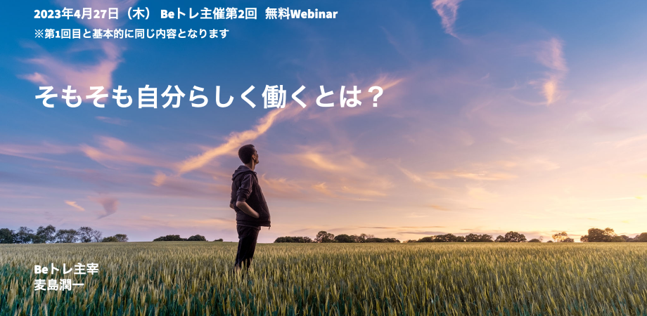 本無料Webinarでは、オンラインサロン『Beトレ』を主宰する麦島 潤一が「自分らしく働くとは?」とテーマにお話しします。