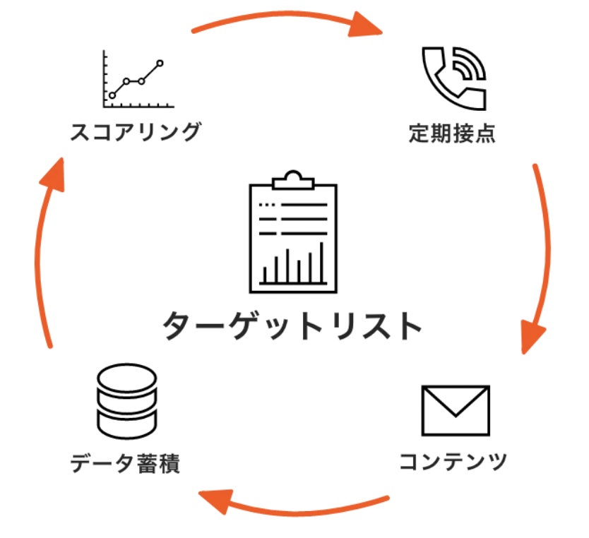 リストを消化していくテレアポ組織ではなく、リードナーチャリングの仕組みを構築し、ターゲッリストを適切に運用するインサイドセールス組織で長期的に有効商談を産み続ける仕組みを作っていきます。