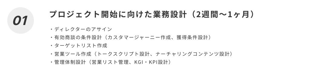 まず、当社のディレクターが貴社商品のカスタマージャーニーを元に、有効商談を獲得するために必要なリードナーチャリング体制を設計します。貴社専属のインサイドセールスチームを短期間で弊社内に組成し、有効商談を獲得しながら長期的に成果を産み続けられるような業務オペレーション(リードナーチャリングの仕組み)をブラッシュアップしていきます。