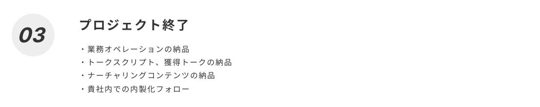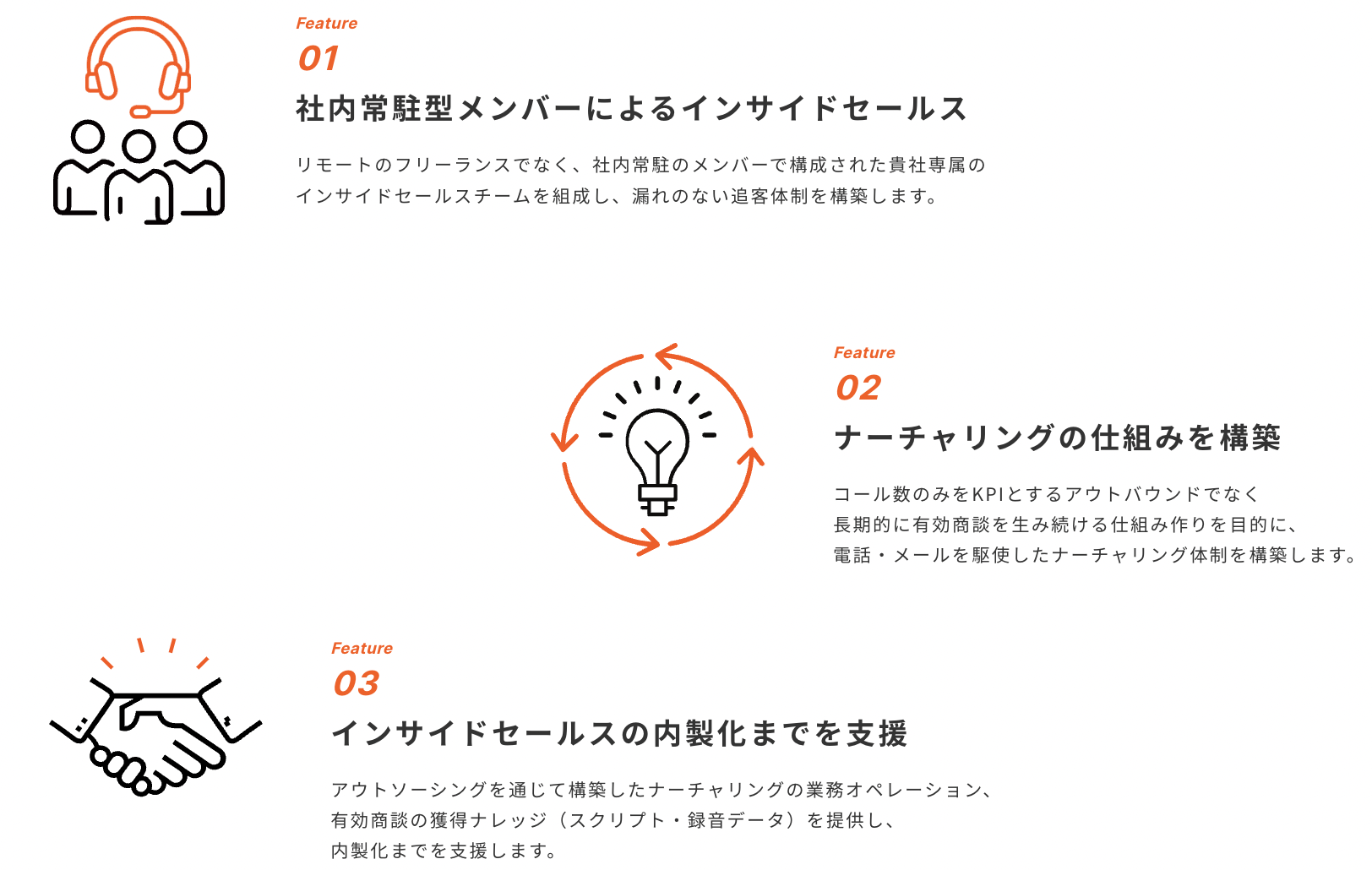 営業アウトソーシングは「ノウハウが自社に溜まらない」「継続的に使い続けないといけなくなる」との評価を受けることも多々ありますが、当社ではインサイドセールス業務を代行することで、成果創出のための型や実行ノウハウを蓄積し、クライアント内での実装までを実現していきます。