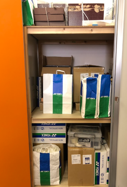 収納しているもの:大会トロフィー・古くなったシャトル・大会で設置する除菌用品・文房具など