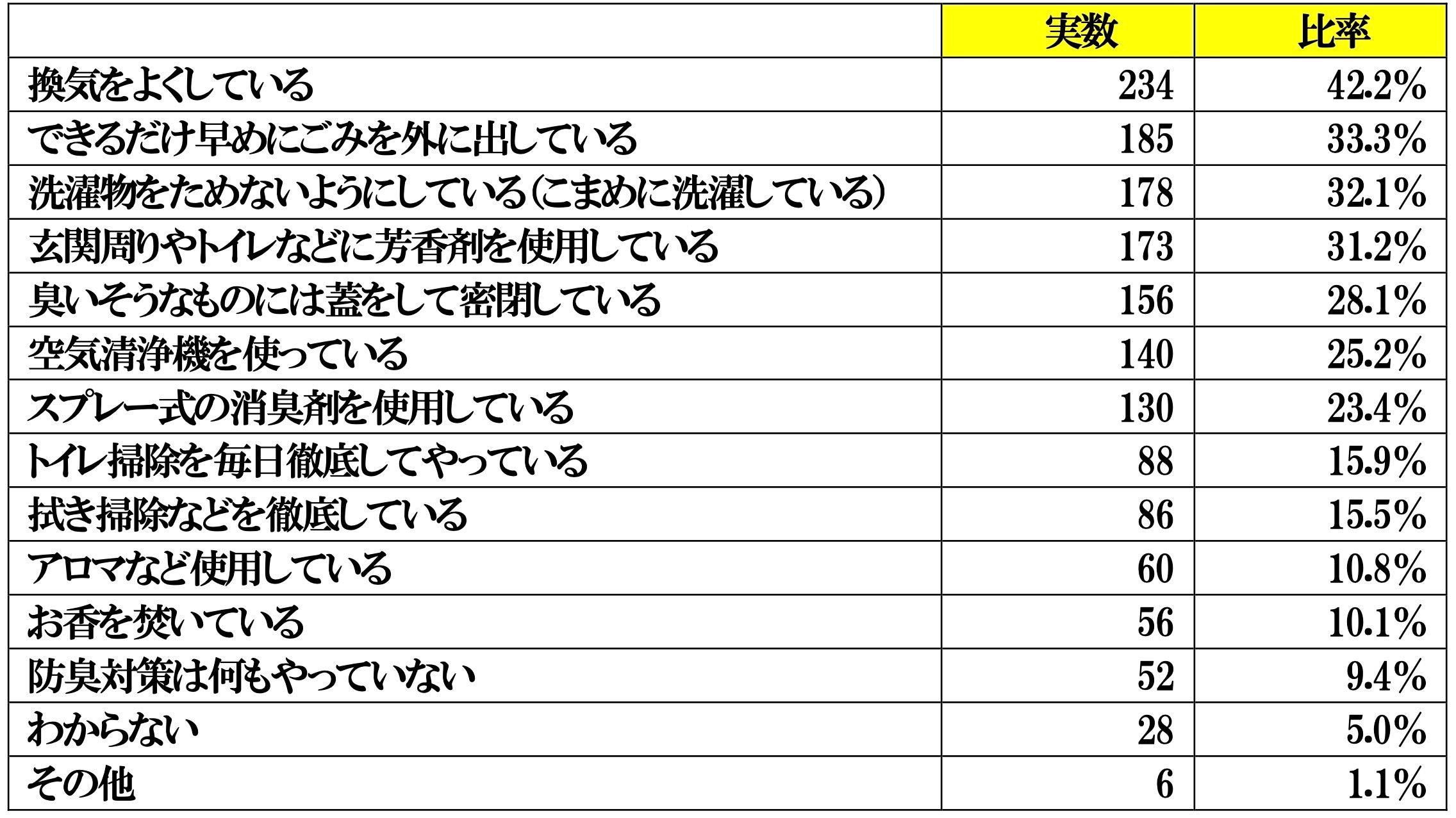 そのため、自宅の防臭対策としては、「換気をよくしている」(42.2%)が最も多くなっています。換気のために窓を開けるのが一般的ですが、光熱費が高騰する中、冷暖房費を抑えたい気持ちと相反することが気がかりです。さらに、生ごみの臭い対策として「できるだけ早めにごみを外に出す」(33.3%)、「臭いそうなものには蓋をして密閉している」(28.1%)、汗臭さ対策として「洗濯物をためないようにしている」(32.1%)、臭いやすい「玄関周りやトイレなどに芳香剤を使用している」(31.2%)と続いています。