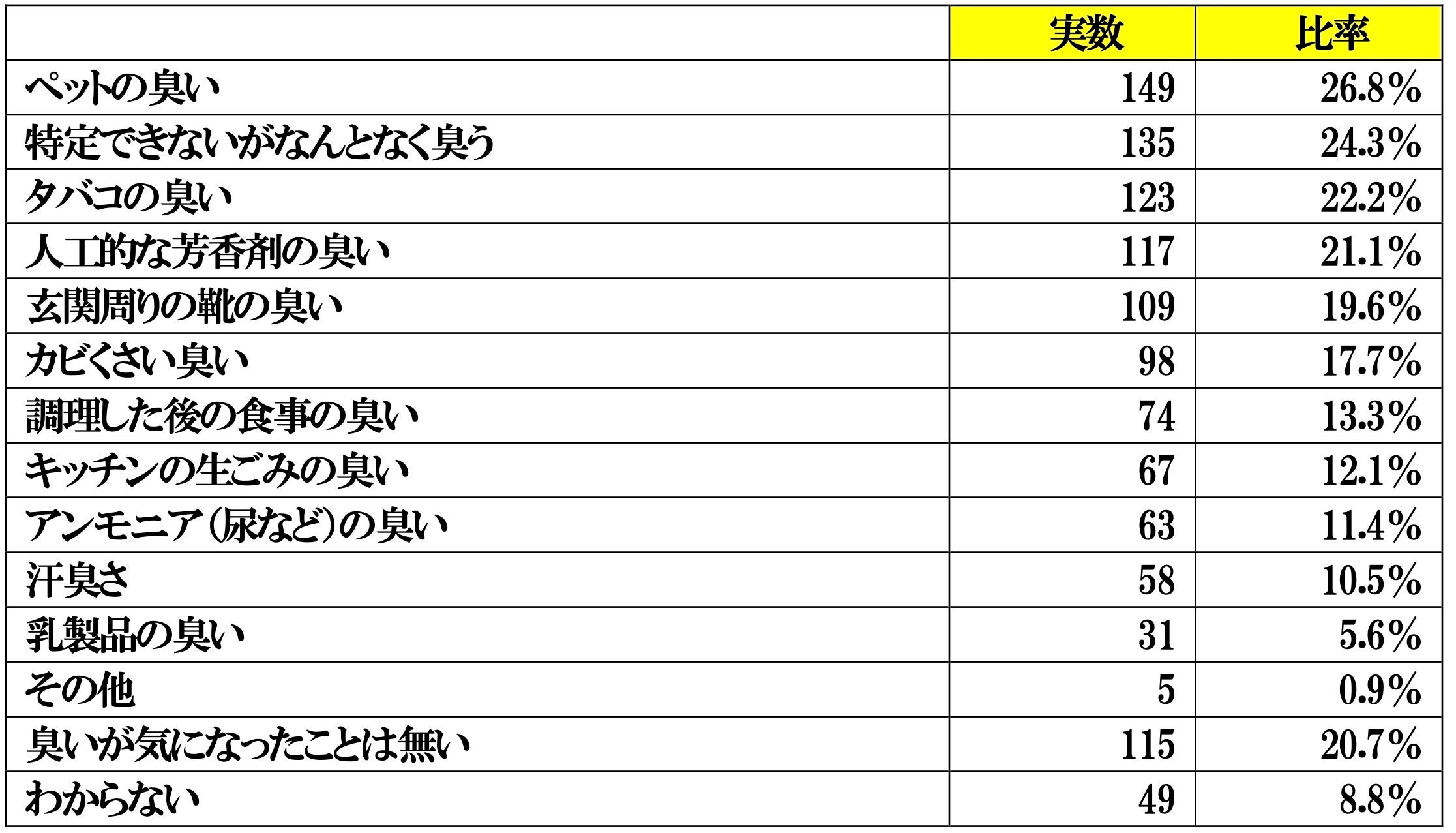 毎日生活する中で自宅の臭いには慣れてしまいやすいものです。しかし、他人の住まいに行った時はその住まい独特の臭いがすることもあります。今回の調査でも、他人の家に行って何らかの臭いが気になったとの回答が70.5%になりました。その臭いは、ペットの臭いが最も多く26.8%。続いて特定できないがなんとなく臭うと思った方が24.3%となりました。さらにタバコの臭い、人工的な芳香剤の臭い、玄関周りの靴の臭いなどが上位となっています。また、このような臭いが自宅でもしていないか心配になる方が8割以上となっており、普段は気付きにくい自宅の臭いに対して敏感になっていることが判明しました。