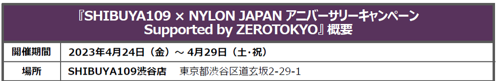 本キャンペーン開催を記念して、4月28日(金)、4月29日(土・祝)の2日間、SHIBUYA109渋谷店 店頭スペースにて「 SHIBUYA109 × NYLON JAPAN アニバーサリーパーティー Supported by ZEROTOKYO 」を開催いたします。