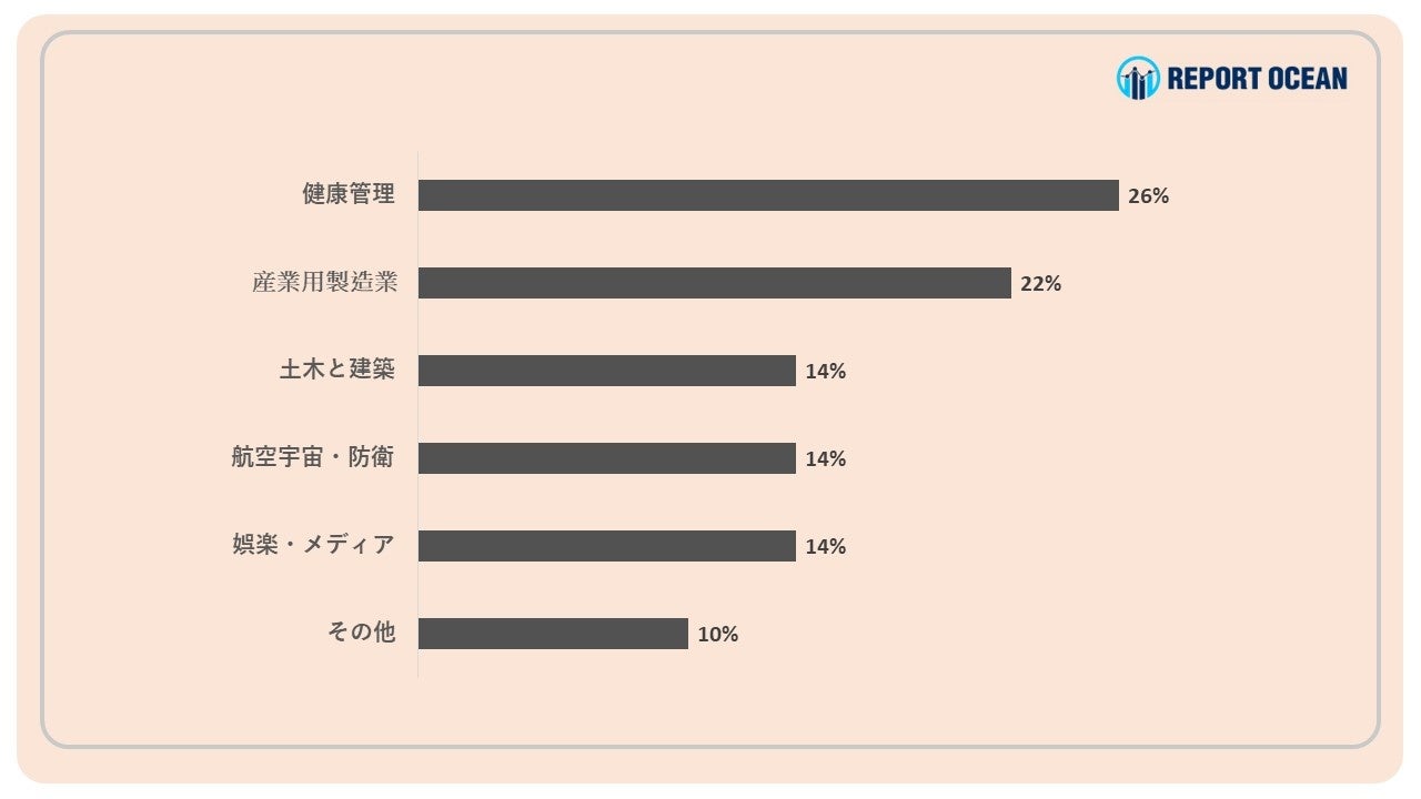 用途別では、娯楽・メディア、航空宇宙・防衛、医療と健康管理、土木と建築、工業製造、その他にに分かれています。医療と防衛分野は、2022年に最大のシェアを獲得しました。