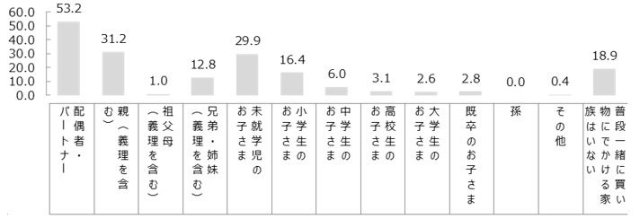 「もぐもぐチャレンジ」参加者の年齢層は30-40代が計66%と多く、およそ3分の2の割合を占める。実施スーパーマーケットの利用者全体と比べると、20-30代の割合が高い結果で、特に男性の参加割合が高い。買い物に一緒に行く家族は配偶者・未就学児の子どもが多いため、ファミリーで参加されていることが伺える。