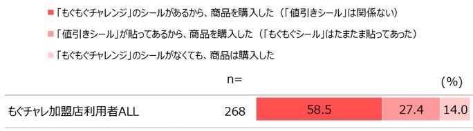 「値引きシール」と「もぐもぐシール」それぞれの目的購買率を比較した場合、「もぐもぐシール」の目的購買率が「値引きシール」に比べて2倍以上も高いスコア。「もぐもぐシール」は参加者にとって値引きより意義の高いシールであると考えられている。