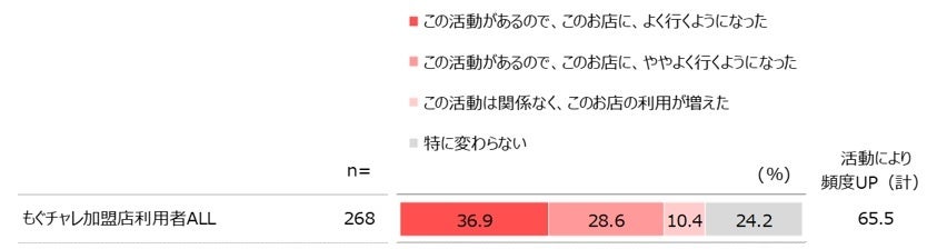 「もぐもぐチャレンジ」の参加者は、来店頻度に対してもポジティブな傾向が見られ、66%は来店頻度が高くなったと回答。シールを10枚集めるというメカニズムにより、実施店舗の客数アップや売上アップといったプロモーション側面への効果も推測される。