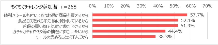 もぐもぐチャレンジの参加理由は、「お得に商品を買うことができ」、「食品ロスを減らす活動に賛同」しているから、そして「気軽に参加できる」というスコアも高い結果に。スーパーマーケットという日常の買い物の中で気軽に社会貢献活動に参加できる点が、この活動の魅力であると言えそうだ。