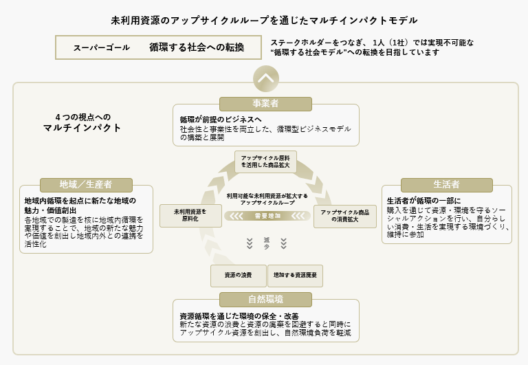 ファーメンステーションの事業の根幹にあるものは「未利用資源のアップサイクルループ」です。未利用資源をアップサイクルした原料や商品が広がることを通じて、「地球環境」「地域/生産者」「事業者」「生活者」のマルチステークホルダーにポジティブなインパクトを与えることができるモデルであると定義をしました。これらのマルチインパクトが集約された結果として、最終的なスーパーゴールとして「循環する社会への転換」を目指したいと考えています。