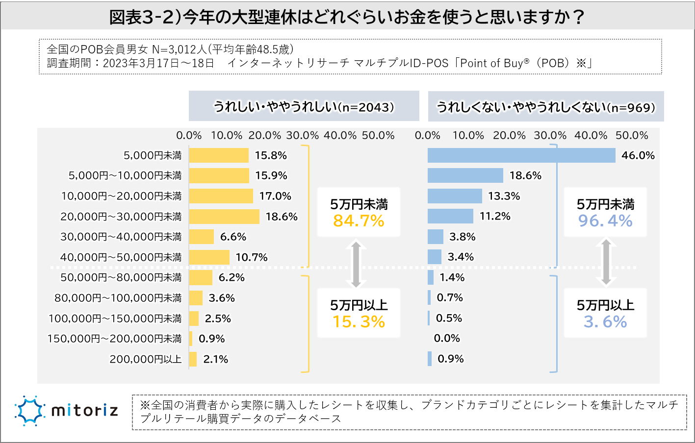 また大型連休を「うれしい・ややうれしい」と捉えている人は5万円以上の予算を想定している割合が15.3%でしたが、「うれしくない・ややうれしくない」と捉えている人は3.6%となり、連休を楽しみにしている人ほど予算が高い傾向が出ています(図表3-2)。
