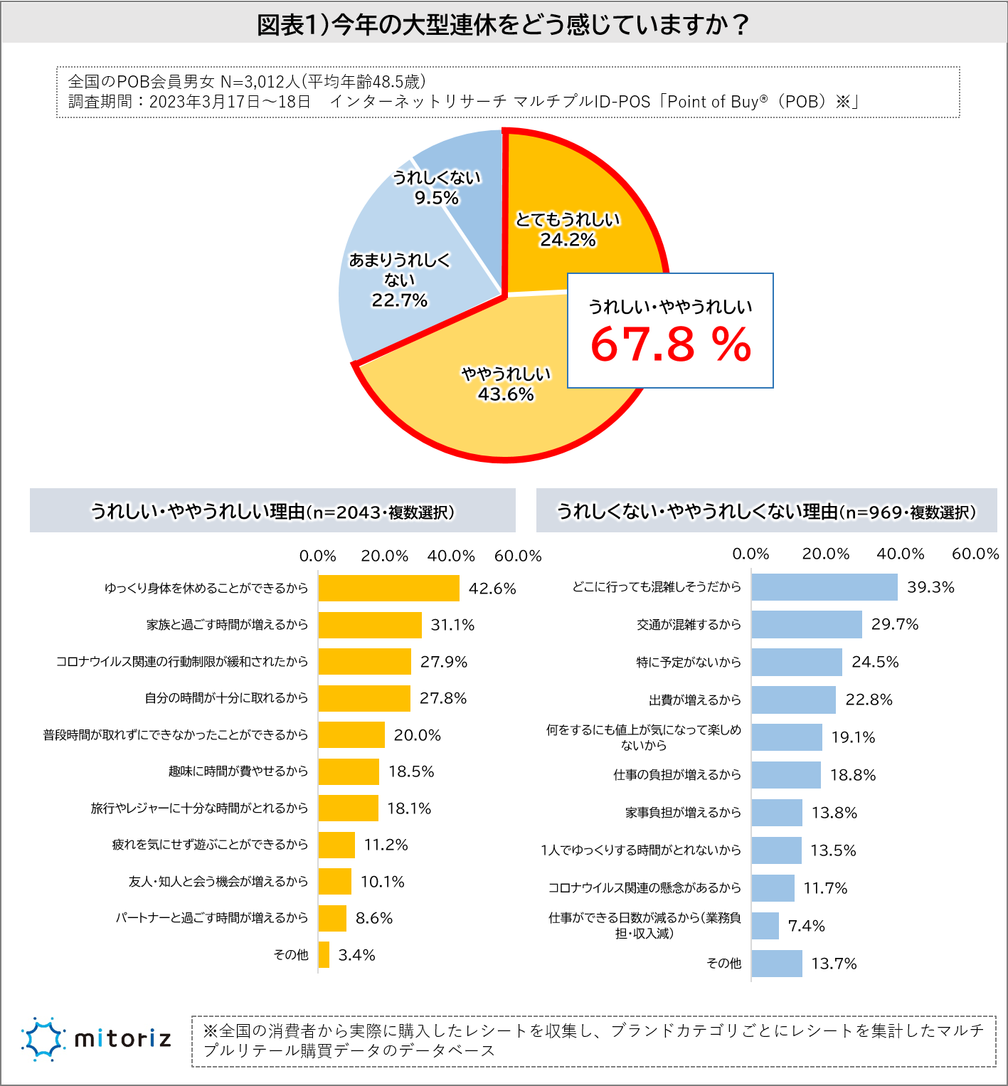- 約7割は大型連休を「うれしい」と感じており、理由は「ゆっくり身体を休められる」が42.6%でトップ