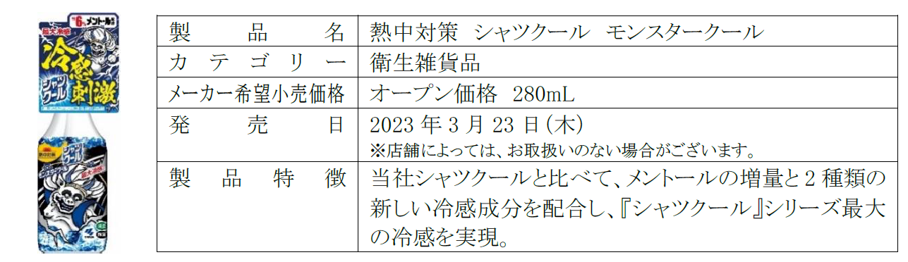 そこでこの度、メントールの増量に加えて新たに2種類の冷感成分を配合した『シャツクール』シリーズ史上最大の冷感を実現した「熱中対策 シャツクール モンスタークール」を発売する運びとなりました。