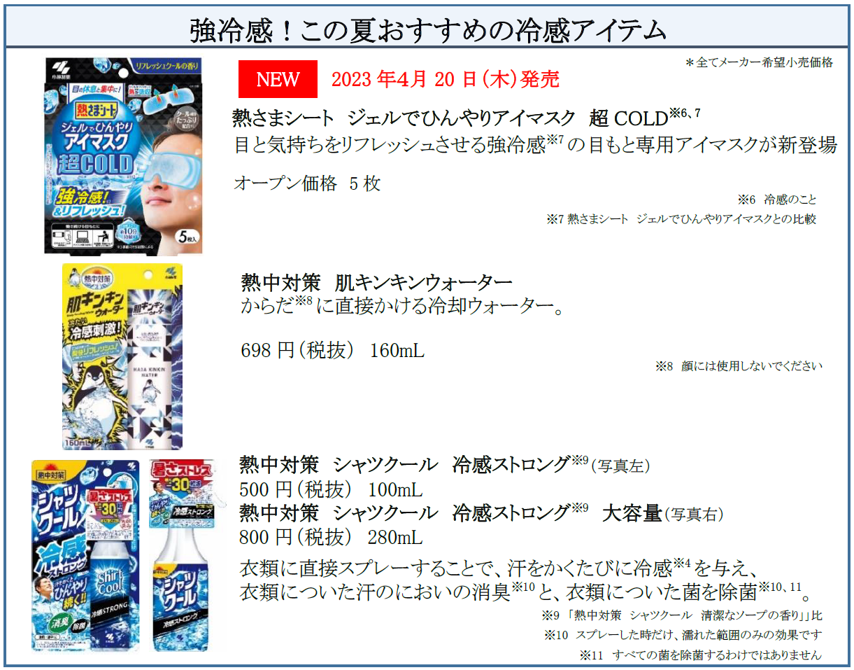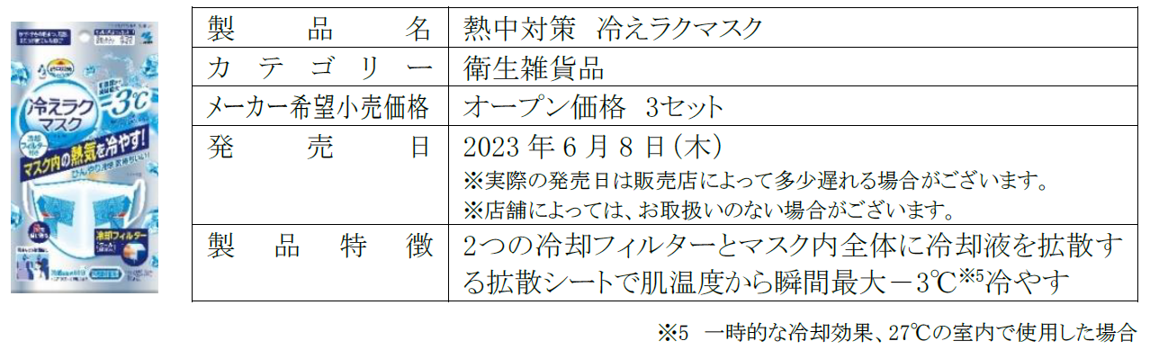 また、規制緩和の中でも夏のマスク着用が必要なシーンに使用いただける、弊社のフィルター付マスクの技術を応用した「冷えラクマスク」を発売することで、厳しい暑さへの“あったらいいな”にもお応えいたします。