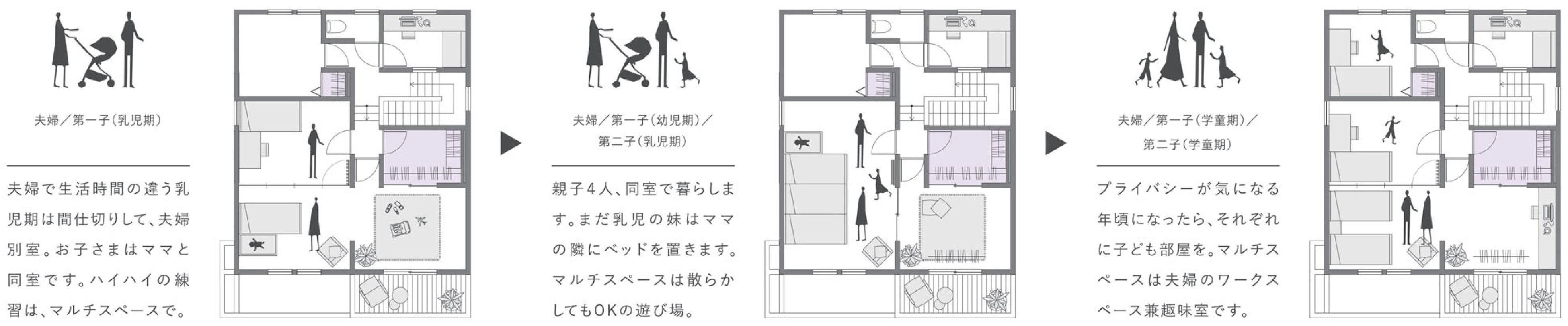 2階は家族の成長にあわせて間取りを変更できる「マルチゾーニング設計」。可動の「マルチパーテーション」で2部屋に仕切れる広いワンルーム、多目的に活用する「マルチルーム」で多様なライフスタイルやその変化にフレキシブルに対応します。各居室の収納は「ファミリークロゼット」に集約しているため、各部屋をより多用途に使うことができます。
