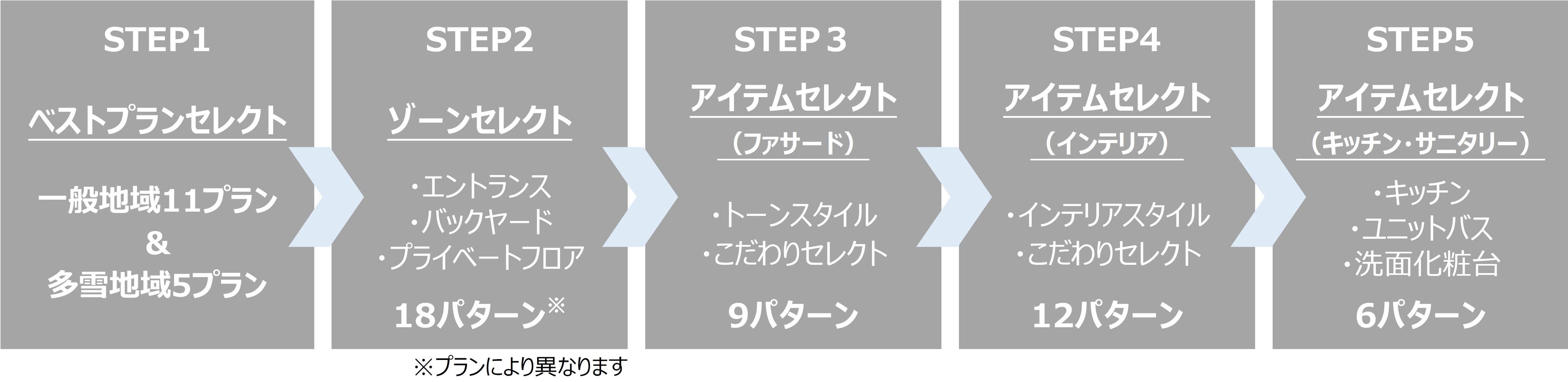 ライフスタイルが多様化するなか、住まいに求められるニーズも多様化しています。「MISAWA STYLE SELECT」では膨大な建築実績や昨今のニーズを分析して厳選したおすすめのプランや間取り、外観、インテリア、キッチン・サニタリーを用意。5つのステップで家族の多様なニーズを叶える住まいづくりをお手伝いします。
