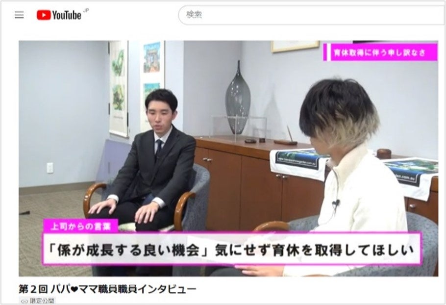 実際に育児休業制度等を利用した職員のインタビューを配信(職員のみの限定公開)。育児に関する休業への認知を高め、育児と仕事の両立がしやすい職場環境づくり。(共生社会推進課での取組)