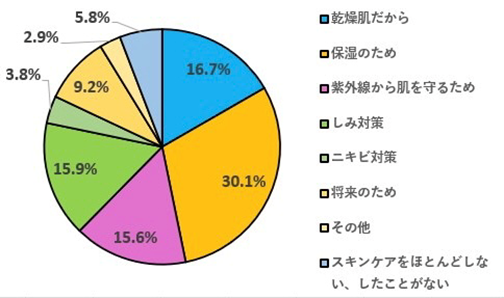 「保湿のため」が30.1%で「乾燥肌だから」が16.7%となっています。両回答を大括りして”水分を逃さない”という見方をすると46.7%と過半数近くになります。続いて「紫外線から肌をまもるため」が15.9%で外部からの攻撃をディフェンスする目的です。