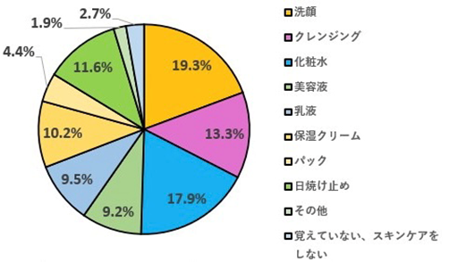 スキンケアの基本の「洗顔」が19.3%です。続いて「化粧水」が17.9%。ここまでは洗顔からの一連の流れですね。「クレンジング」が13.3%となっています。しっかりとお化粧を落とすためにクレンジングは大事です。