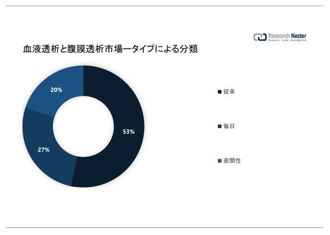 世界の血液透析と腹膜透析市場もセグメント化され、需要と供給が従来、毎日、夜間性に分類されて分析されています。連日血液透析では、毎日長時間(6―8時間)の治療が行われます。夜間血液透析では、患者が眠っている間に一晩中実施されます。しかし、週に 3 回、各セッションで 3ー4 時間実施される従来の血液透析が依然として最も普及しており、2035 年末までに最大の市場シェアを獲得すると予想されています。世界的に、そして先進国でも腎臓病の数を増やしています。たとえば、調査によると、毎年約 600,000 人のアメリカ人が透析を受けています。