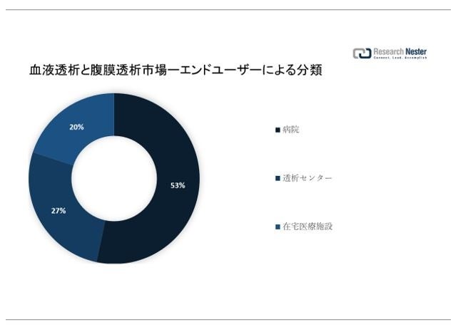 世界の血液透析と腹膜透析市場は、病院、透析センター、および在宅医療施設のエンドユーザー別に需要と供給について分割および分析されています。これらのセグメントの中で、病院セグメントは、世界中の透析患者数の急増に加えて、腎臓移植のために入院する患者数の増加に支えられて、2035 年末までに最大の収益を獲得すると予想されています。たとえば、2018 年には 229,000 件の腎臓移植が行われ、554,000 人の患者が腎機能を置き換えるために透析を受けました。