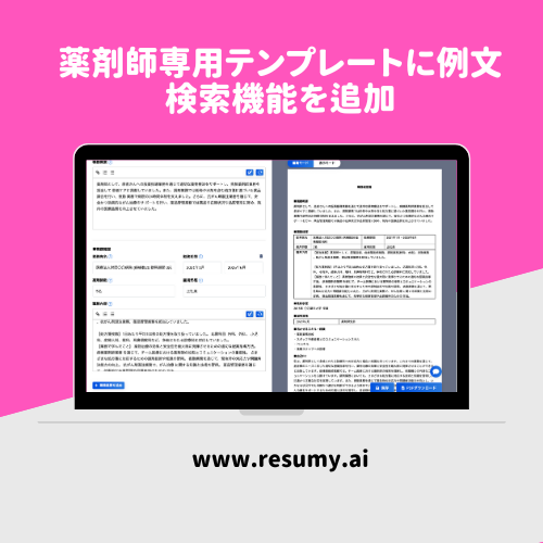 レジュミーAIは、薬剤師向けの職務経歴書テンプレートに、新たに豊富な例文検索機能を追加したことを発表いたします。これにより、AIによる文章生成のほか薬剤師の経歴書特有の例文を利用して、より効果的な職務経歴書を作成することが可能になりました。