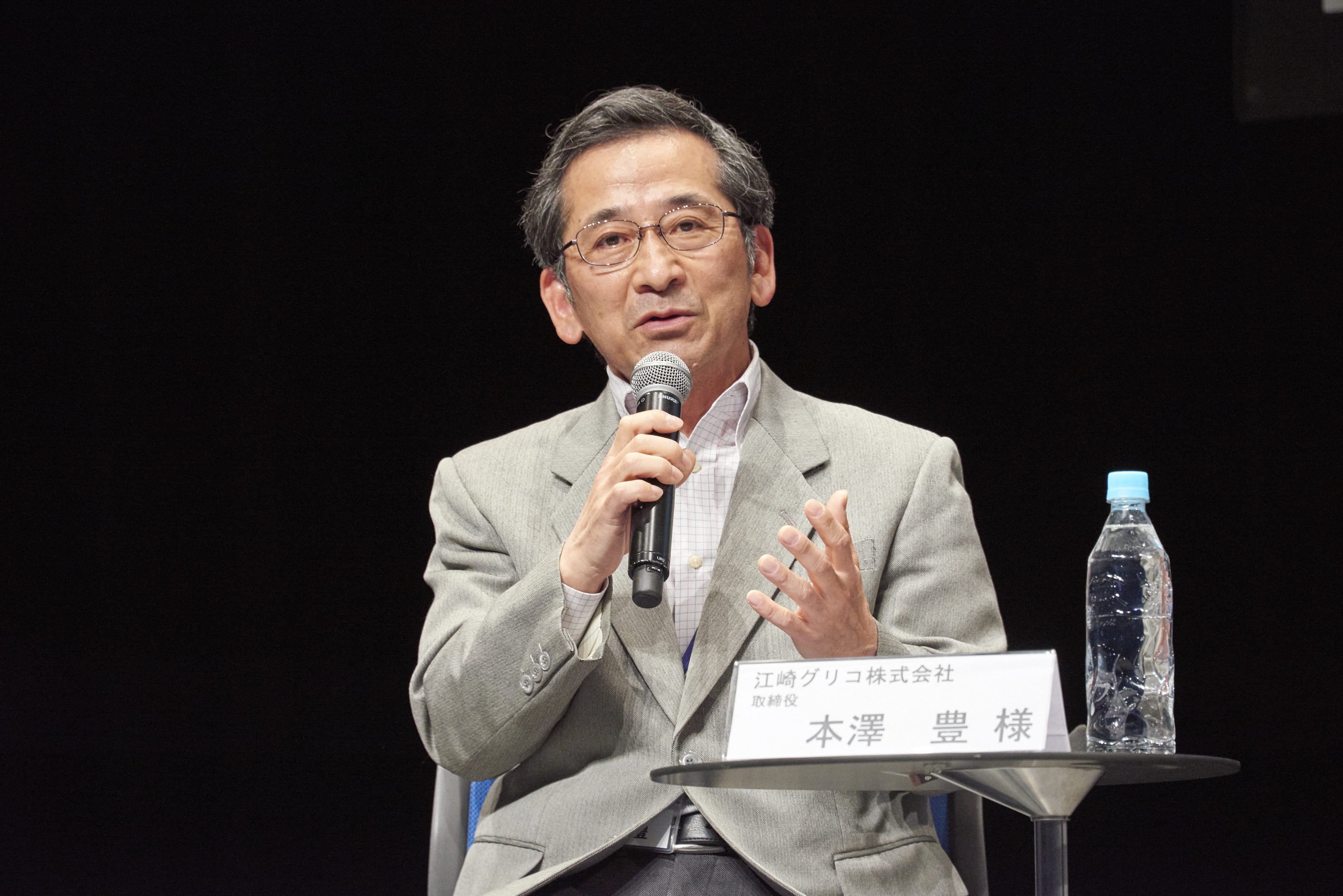 「自らが課題を見つけて問い、仮説でも良いので答えを出す、本分が大切だ。そこでは幼虫がさなぎへと羽化するような様態変化を繰り返す必要。本分と羽化を繰り返すことが、人を絶えず成長させるプロセスだ。」(江崎グリコ 本澤 豊氏・左写真)